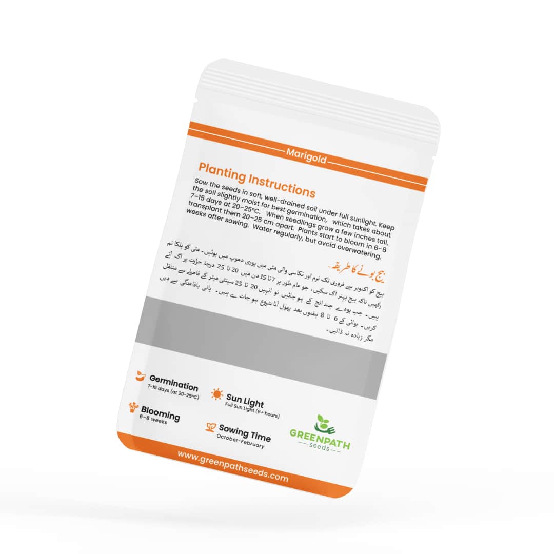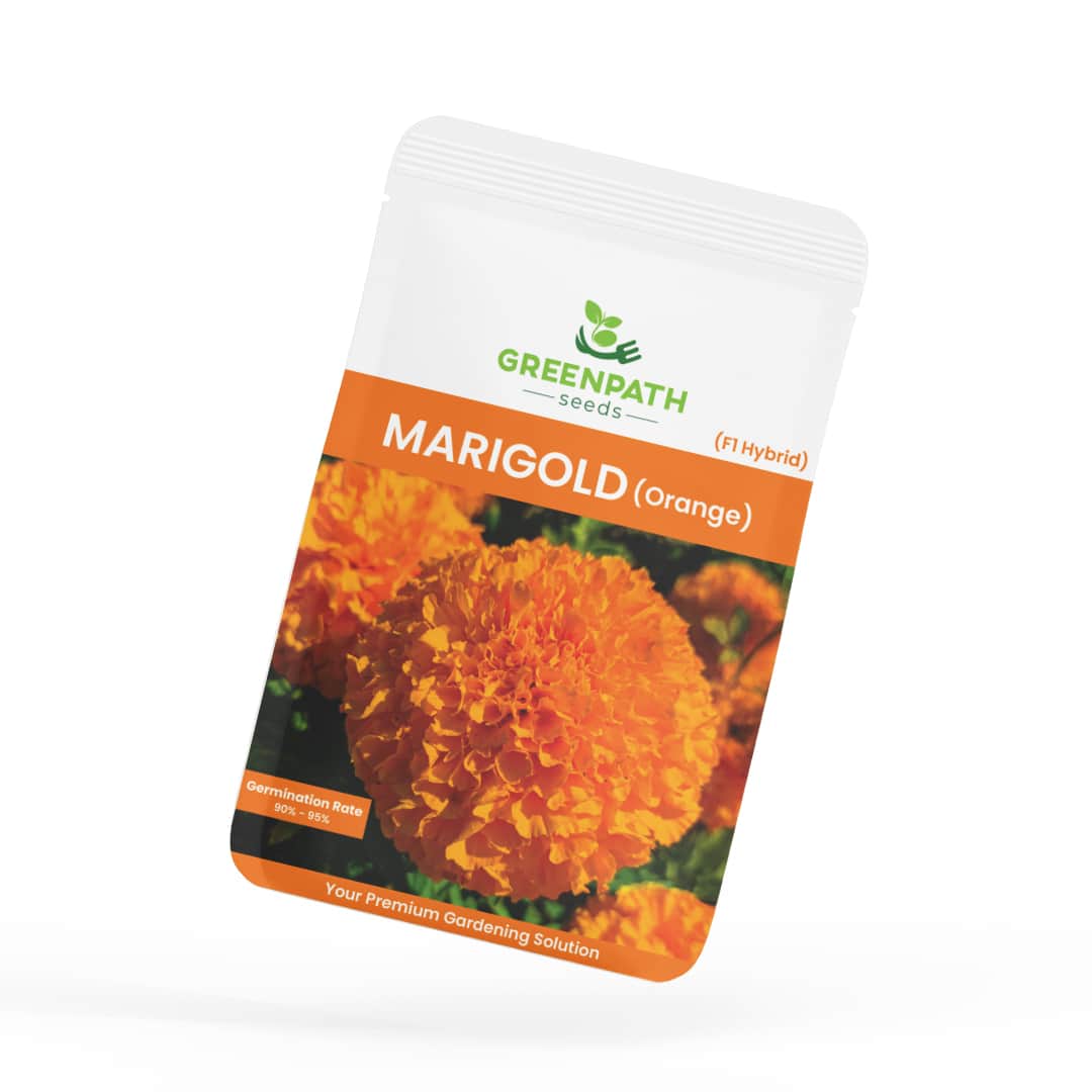 The Marigold Orange (F1 Hybrid) Seeds from GreenPath Seeds is a premium hybrid variety known for its vibrant orange flowers, excellent germination, and quick blooming cycle. Perfect for home gardeners in Pakistan, these hardy plants thrive in local conditions — adding warmth, fragrance, and long-lasting beauty to your outdoor spaces.