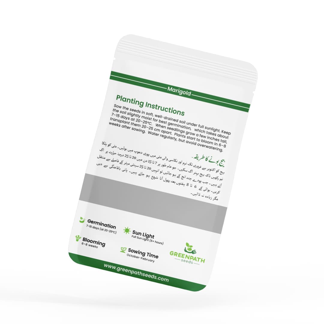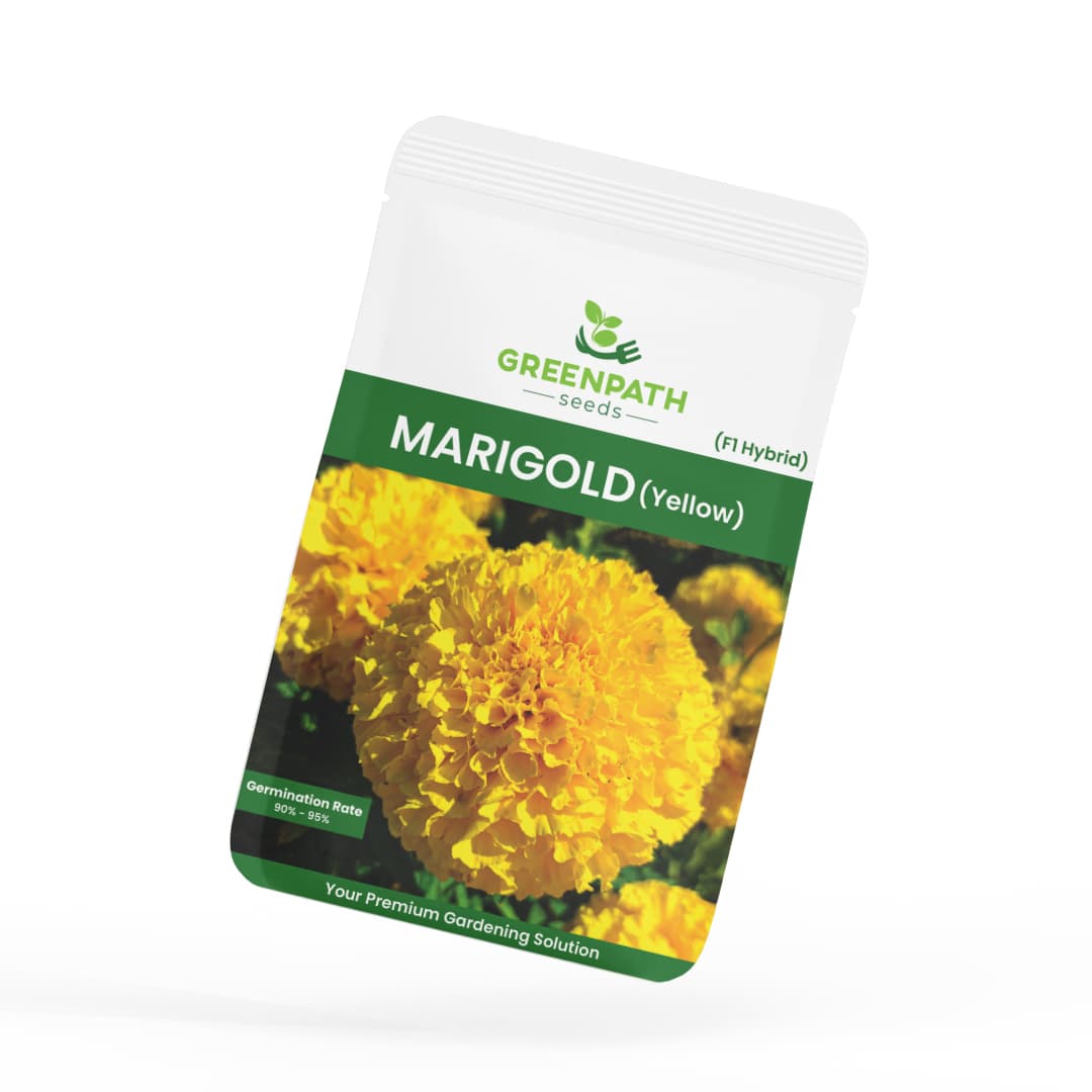 The Marigold Yellow (F1 Hybrid) Seeds from GreenPath Seeds is a premium hybrid variety known for its bright golden blooms, excellent germination, and quick blooming cycle. Perfect for home gardeners in Pakistan, these hardy plants thrive in local conditions — adding warmth, fragrance, and long-lasting beauty to your outdoor spaces.